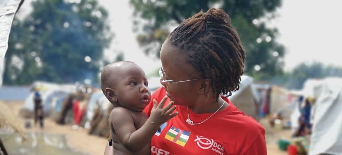 Guira FM reporter Merveille Noella Mada-Yayoro holds a toddler at Birao IDP camp.