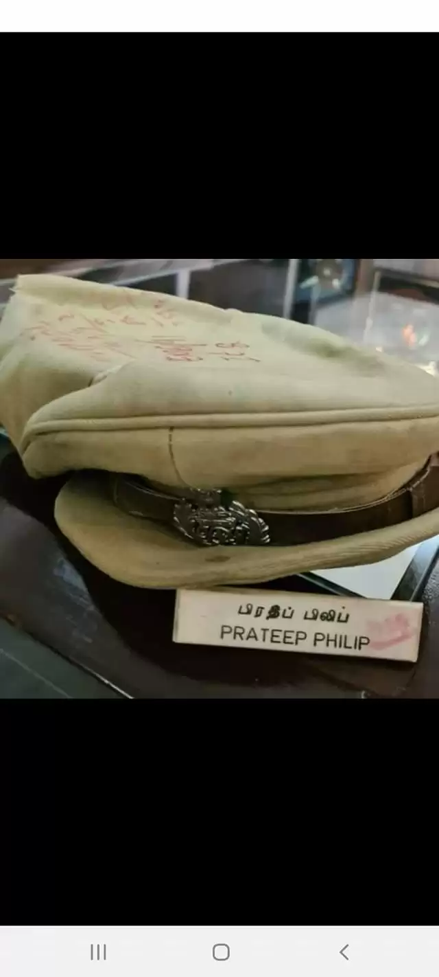 Pratip Philip, Director General (Training), Tamil Nadu Police Force, wore a bloodied hat and badges on his uniform on the day of his retirement from the Indian Police Service. The hat and badge were presented in court as evidence in the assassination of the country's former prime minister. The court allowed the officers to wear it on the last day of his service.
